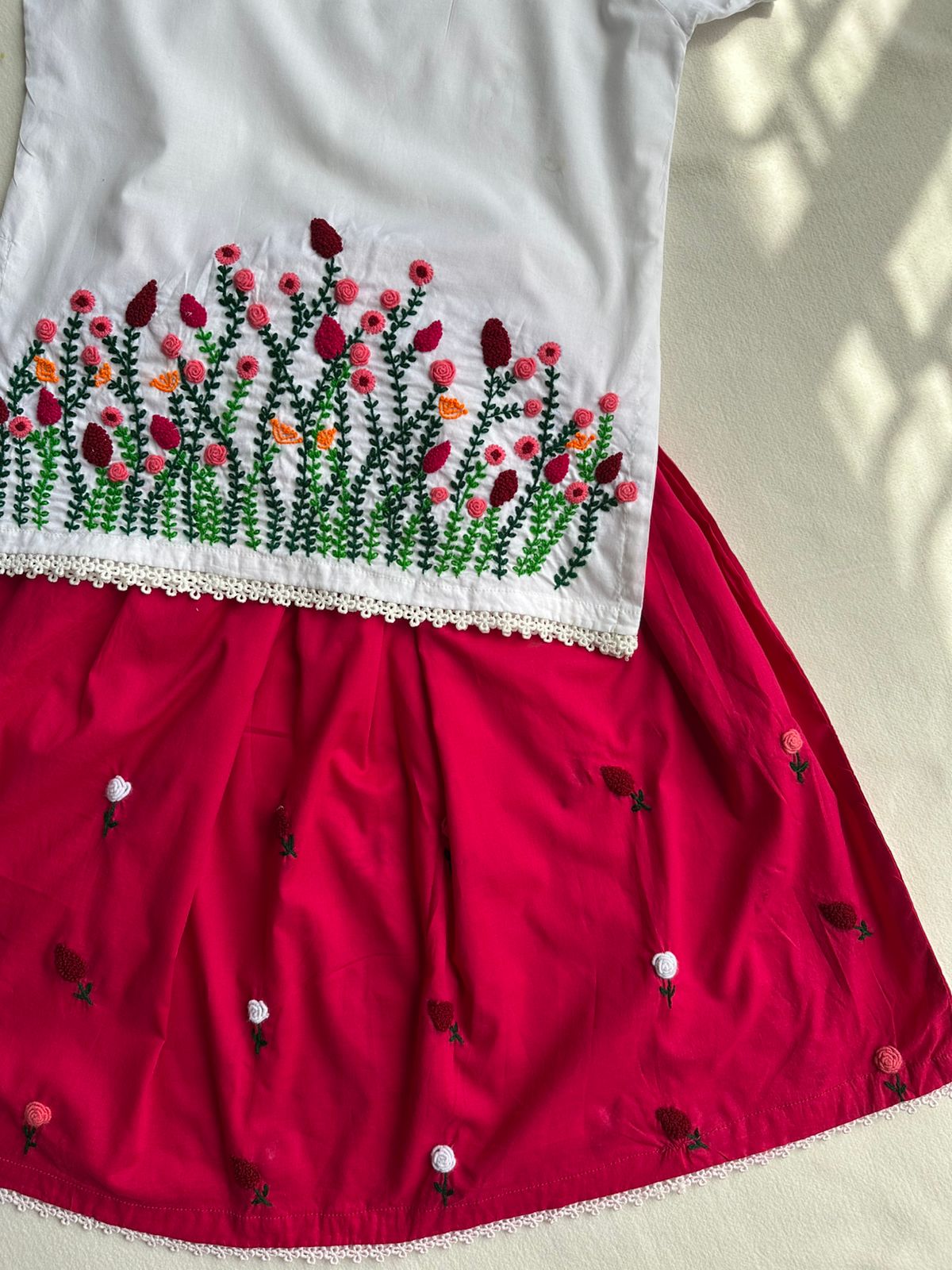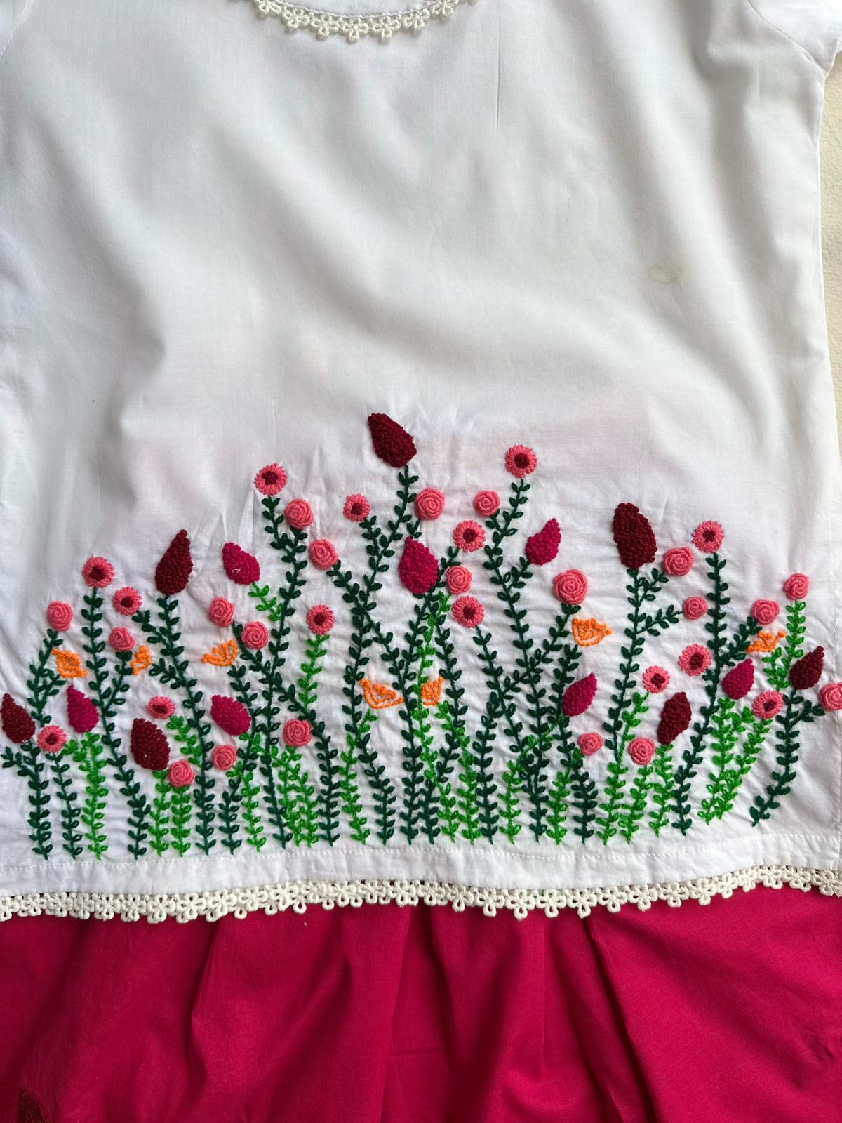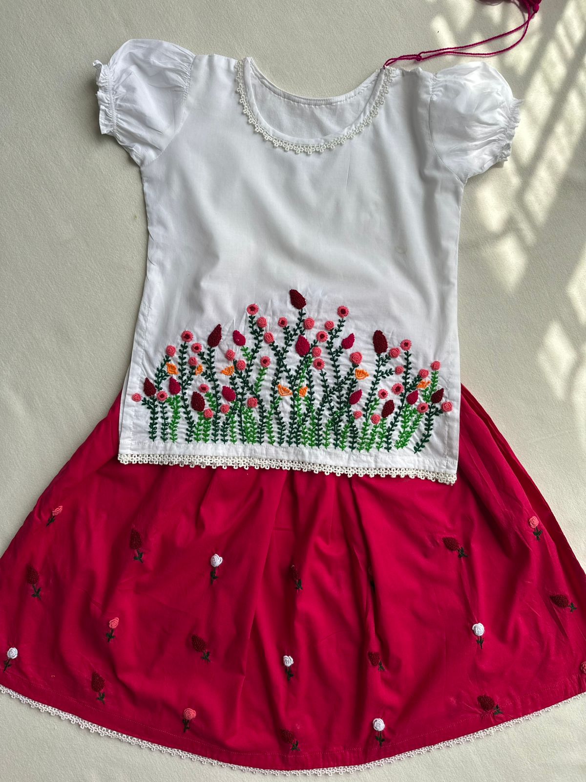 A dreamy fusion of elegance and color! This beautiful white lawn shirt is paired with a shocking pink lehenga, both adorned with delicate flower-style hand embroidery. Finished with fine laces for a graceful look, this 2-piece set brings festive charm and soft comfort together. Perfect for weddings, birthdays, and special moments.