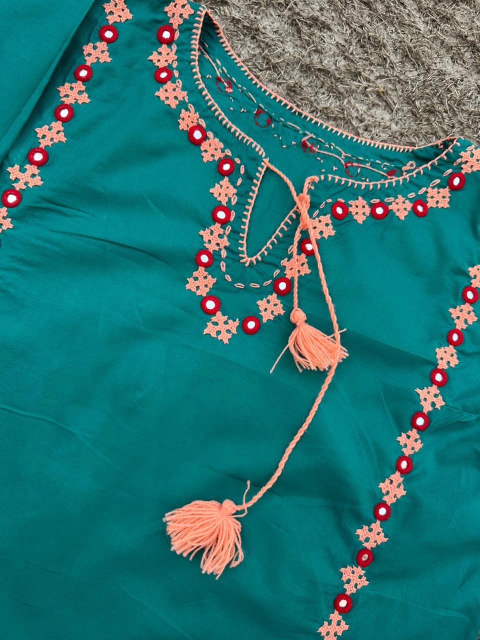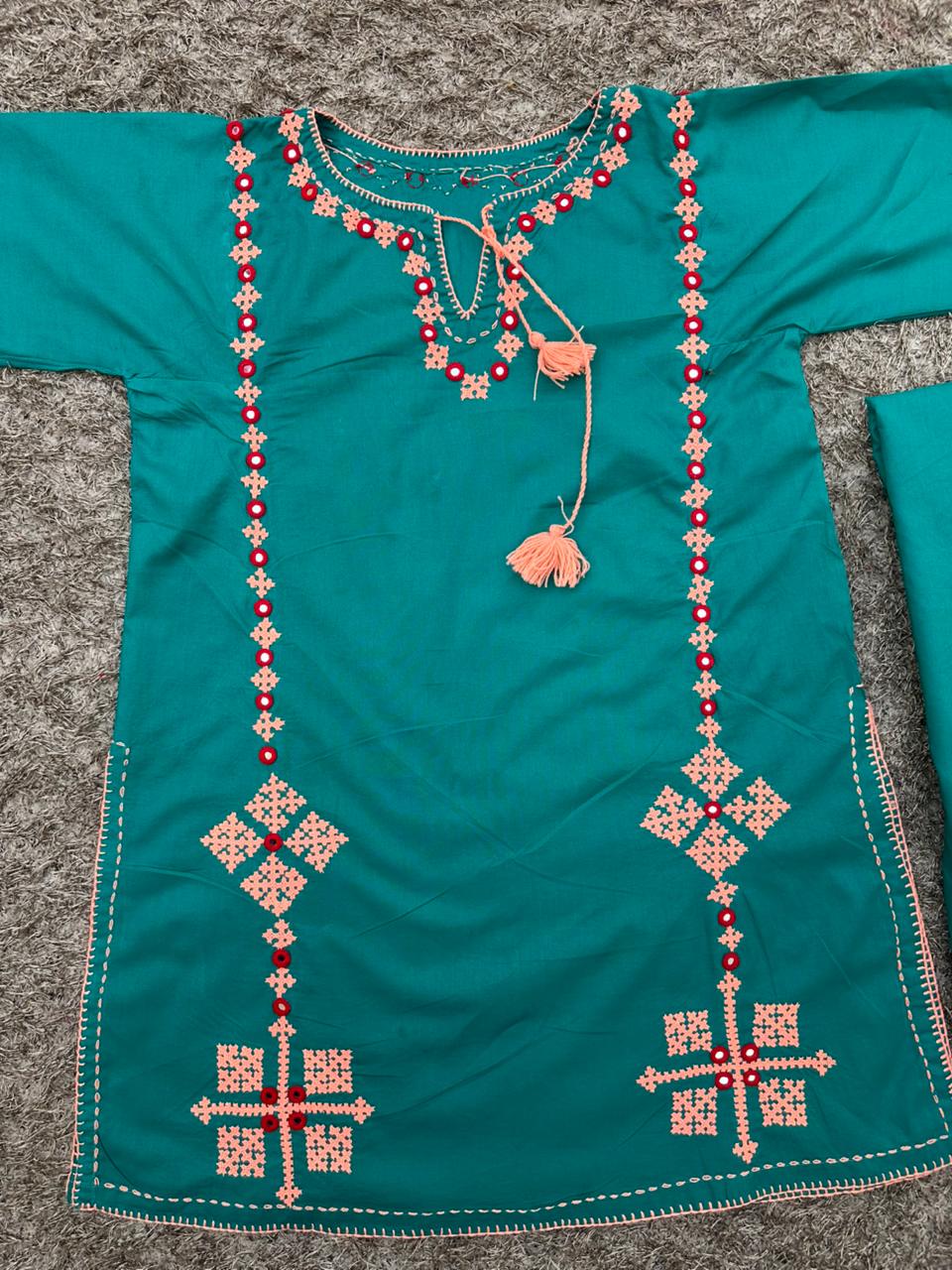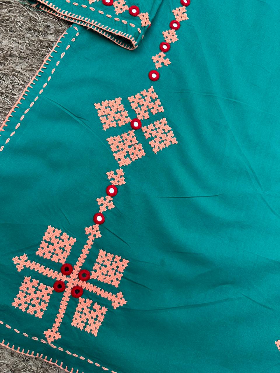 Introducing our Gulmohar Charm – a graceful C green lawn dress featuring a vibrant light peach and red color embroidery in a traditional Gurmacho style. This unique design brings elegance and cultural richness together, making it a standout piece in any wardrobe. Lightweight and breathable lawn fabric ensures all-day comfort, while the handcrafted detailing adds timeless beauty. Perfect for festive and semi-formal wear.