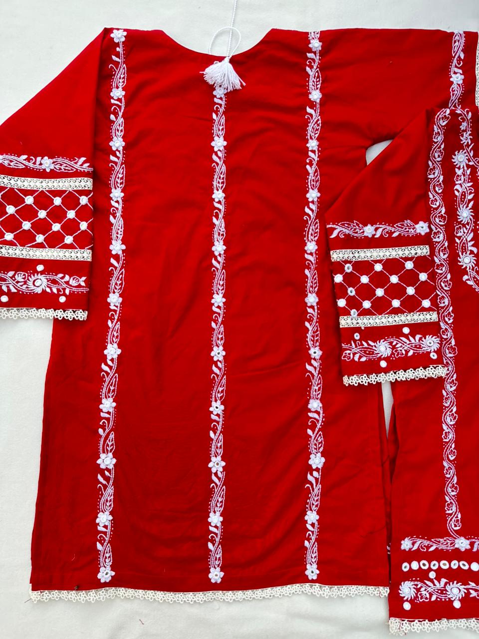 Radiate festive royalty in this stunning red lawn dress, fully adorned with intricate white embroidery and sparkling mirror work ✨ Detailed with heavy lace on sleeves, front and back embroidery, and a beautifully handcrafted neckline – a timeless masterpiece of tradition and style!