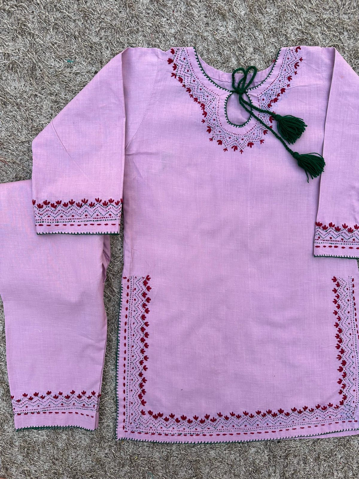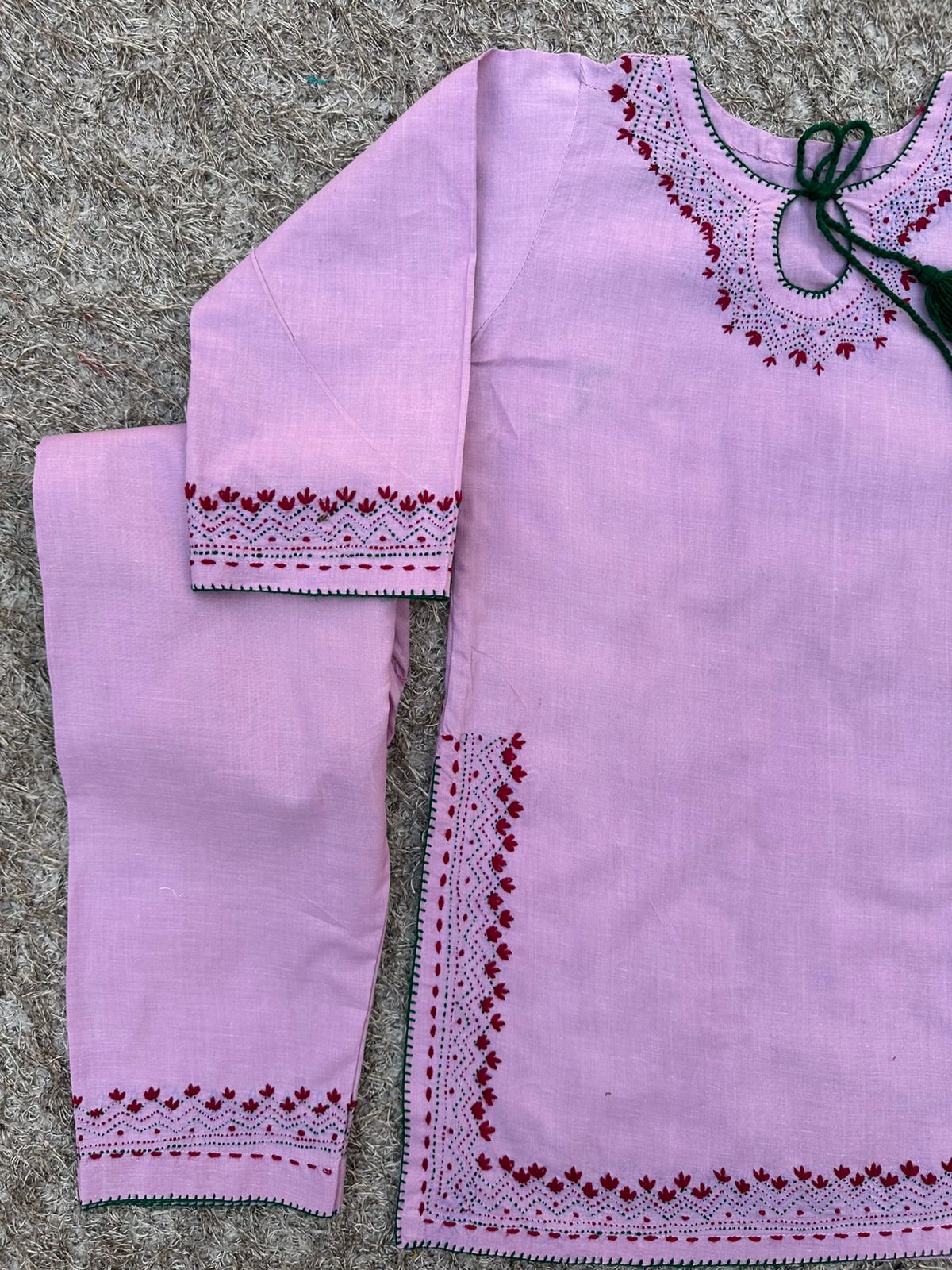 Grace meets grandeur in Rosy Empress — a delicate light pink dress adorned with intricate dark mehroon and green hand embroidery. This uniquely crafted article blends soft femininity with bold, regal detailing. Made from breathable lawn fabric, it’s perfect for graceful daytime wear or elegant festive occasions. A design that truly lives up to its royal name.