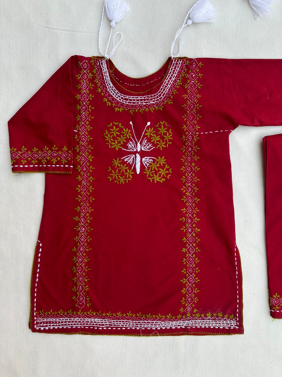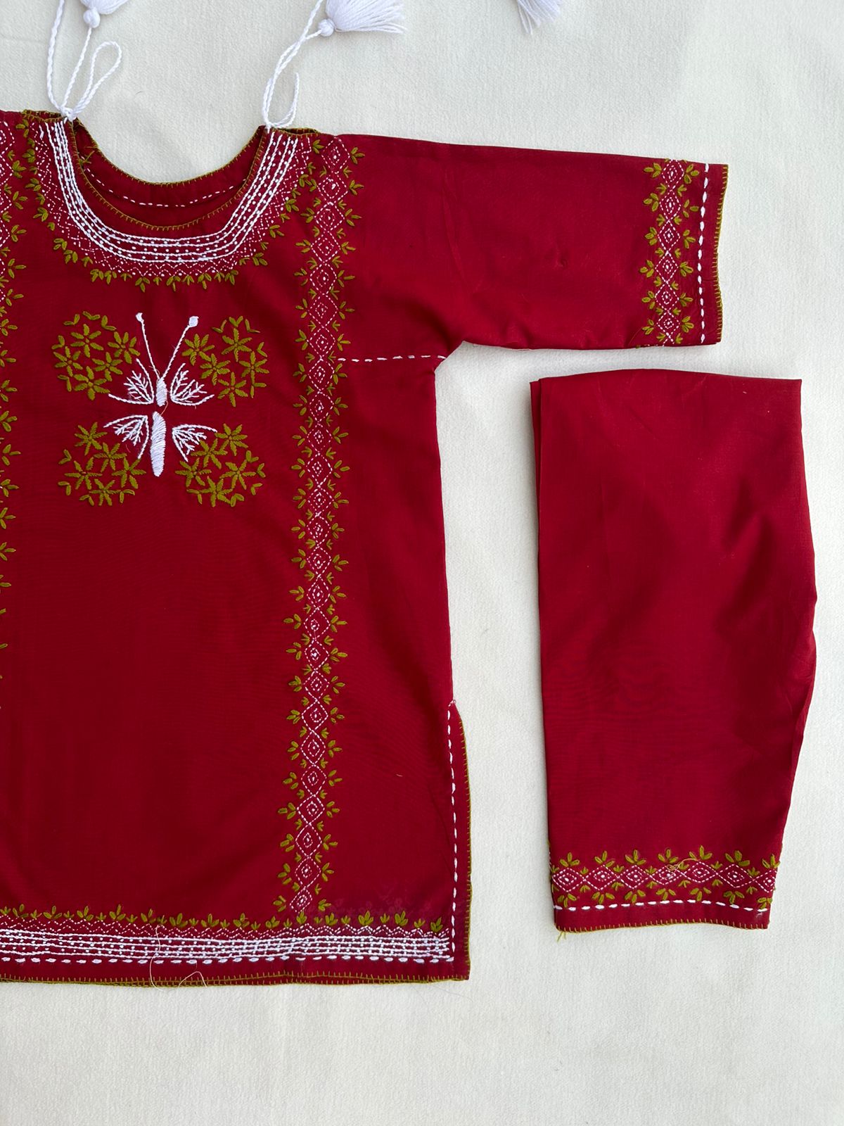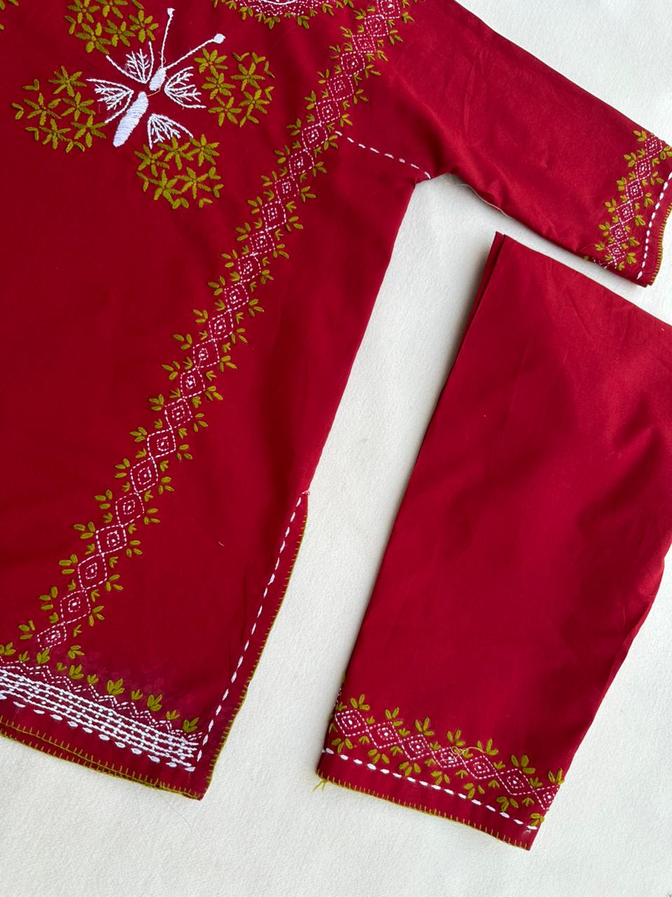 A stunning red-mehroon colored dress featuring elegant butterfly-style hand embroidery. Crafted on premium lawn fabric, this outfit blends tradition with modern grace. The unique design and intricate detailing give it a luxurious and festive look—perfect for any special occasion or summer gathering.
