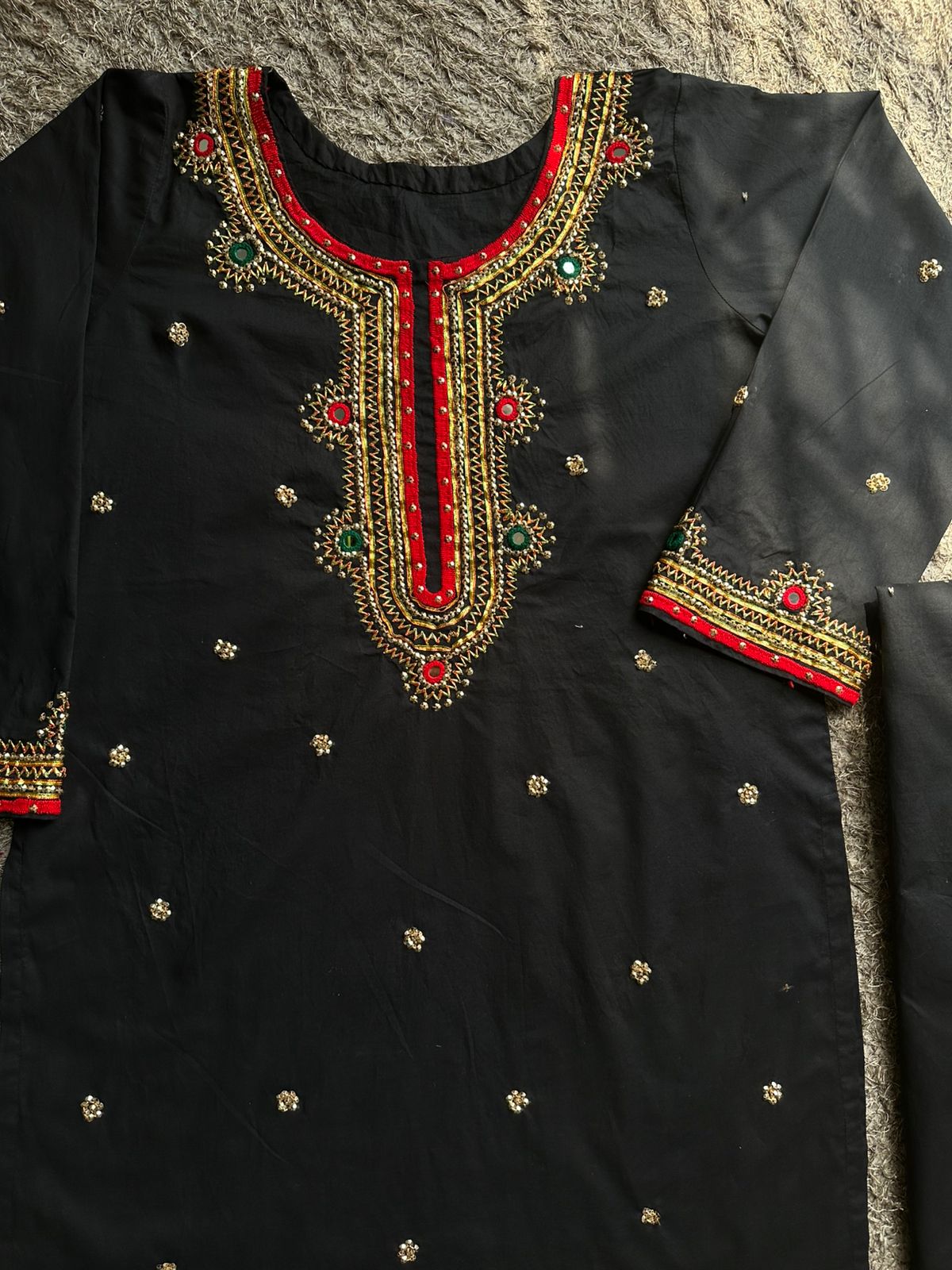 Introducing Suroor-e-Sitam, a masterpiece of tradition and elegance. This luxurious 3-piece black lawn ensemble features exquisite gota kinari, sitara embellishments, and delicate red hand embroidery that brings a bold, romantic contrast to the design.